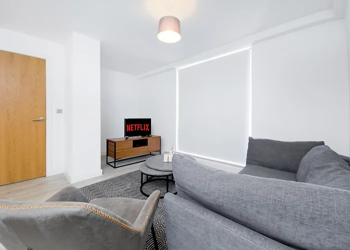 Luxury 2 Bed Flat In Salford Apartamento Mánchester, situado a 1 km de la Biblioteca John Rylands, cuenta con un aparcamiento privado gratuito para los que viajan en coche. Este apartamento está situado en el distrito Salford, a 2 km del Old Trafford.