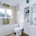 L'Appartamento Comfy 1Br In Salford, Kitchen, Wifi And Parking è dotato di un bagno con prodotti da bagno offerti e teli da bagno.