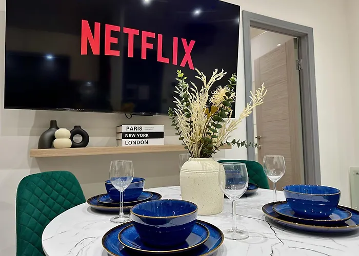 Goście mogą korzystać z pełnowymiarowej kuchni, a także miejsca do jedzenia w obiekcie. Do dyspozycji Gości są również kuchenka mikrofalowa, ekspres do kawy/herbaty i lodówka. Restauacja Favelas, w której serwowane są specjały kuchni brazylijskiej, leży w odległości 350 metrów. Dworzec Ducie Street/Piccadilly znajduje się w kilku minutach od willi FREE Parking - 2BR MCR City Centre Apartment, co zapewnia dobre połączenia z całym miastem.