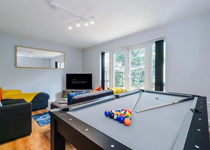 Stunning Townhouse In Salford, Free Parking, Pool Table, Table Tennis, 4Bedrooms Manchester ligger cirka 25 minuter till fots från Phones 4 U Arena och har utsikt över trädgården. Aktiviteter som biljard finns tillgängliga för gästerna för att göra deras vistelse mer minnesvärd.